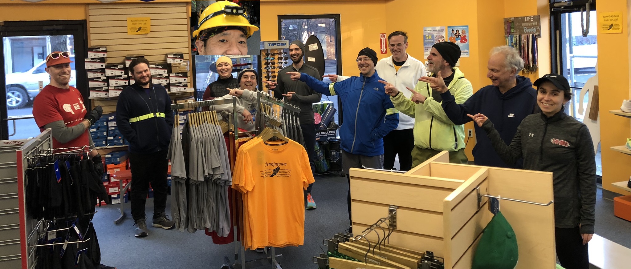 There’s one person who’s virtually made a running career with the club by not being around for the picture but showing up eventually to run anyway. If we stall our departure from the store, we can occasionally catch him. Sometimes we’re right and sometimes we’re wrong. Guess what about this time?
