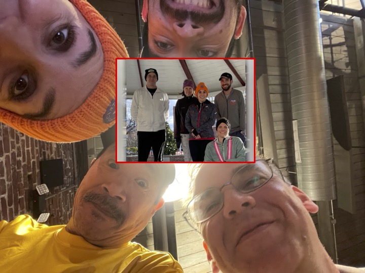 Heads from below looking down on camera with inset of runners framed by railing of Jenkintown center pavilion