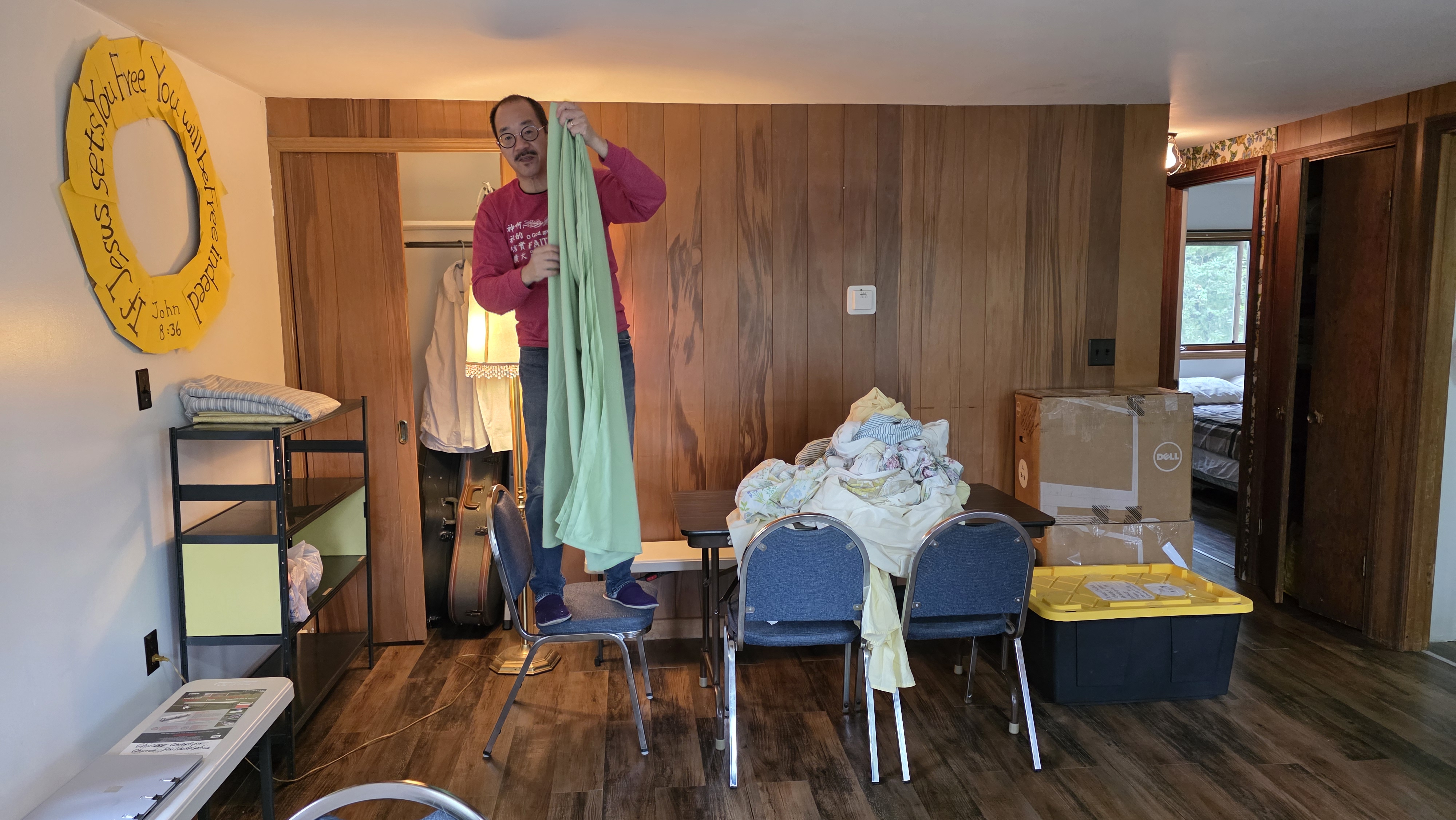 The next day we met the deeply apologetic property manager Ethan. He had mistaken our arrival date for a week later and had had no time to do all the preparations that he had planned for us when he learned his mistake. The previous work team had done fine with sleeping bags—hence the sheets—and the minimalism. Since The Willows sale hadn’t closed yet, we were free to collect any other furnishings we needed. Being a half mile away and with us having a van, we cleared out most of the rest of the stuff. We completed many hours of washing and drying (the heating element was dying) and folding. We set up shelves and placed accessories. We found our rocks. And we did our daily conference preparations.