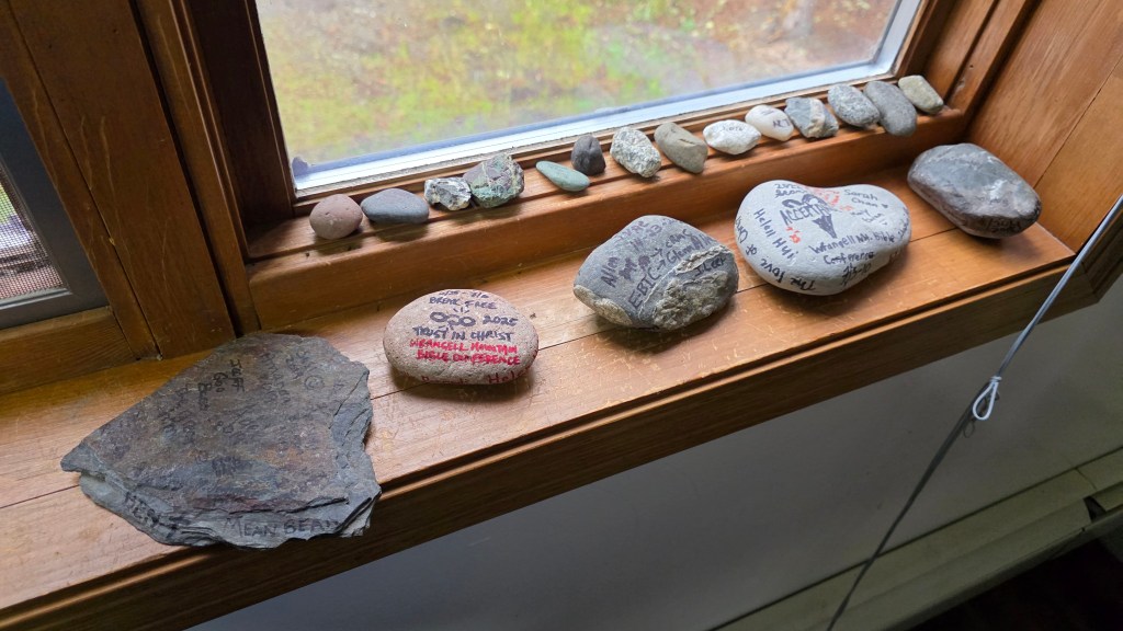 Our team wanted to leave a mark it and we did over the years. It’s not like no one else used The Willows. We would hear of work groups that stayed there for a week or so at a time, but they would always leave the space unadulterated—reasonable, given that it was a rental, after all—but we had all grown accustomed to it. It was our local home. We had left something descriptive of us after my first year in 2015, as a kind of test case of what the host would tolerate. Taking a river stone, we left the name of the event we were serving, Wrangell Mountain Bible Conference, with the year, our theme with scripture verse, and our names. When we found it on the same window ledge in the dining area where we had left it, we were pleased. Someone clearly felt it was worth keeping—they could easily have tossed it out. Decorations that we started leaving on the mostly bare walls—created to use for teaching or the float decorating we did for the Fourth of July Parade—we would find untouched when we returned each succeeding year (iCandybyWangC). We added more memorial rocks. Only one other group ever felt compelled to contribute to the story of the space in the form of their own group of individual rocks on that window ledge.