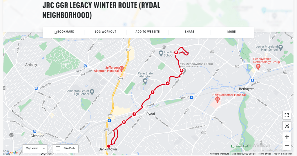 Although the legacy winter route into Rydal served us, it isn’t for everyone. You’re not committed to 6.5 and can turn back at any time, but you have to take Rydal Rd from the store to get there: narrow and without sidewalks. Then you have to cross Susquehanna Ave: pretty busy, at least on the way out. Then you have to know the directions to wend your way up: They can get tricky. And you have to be comfortable running in relative seclusion: You’re really getting back into the neighborhood which can feel pretty isolated in the dark. And then there’s the 1-mile, 3%-ascent final mile. Wow, so why even do it? Answer: It’s legacy. That plus the houses are pretty cool and the traffic is light up there. But all the negatives speak to the reason for finding something more friendly in every way. We all like the Sunset 5K route as long as we’re not doing it incessantly. We’ve also just started experimenting with EPBR’s 5-rights Run (3.5 miles).