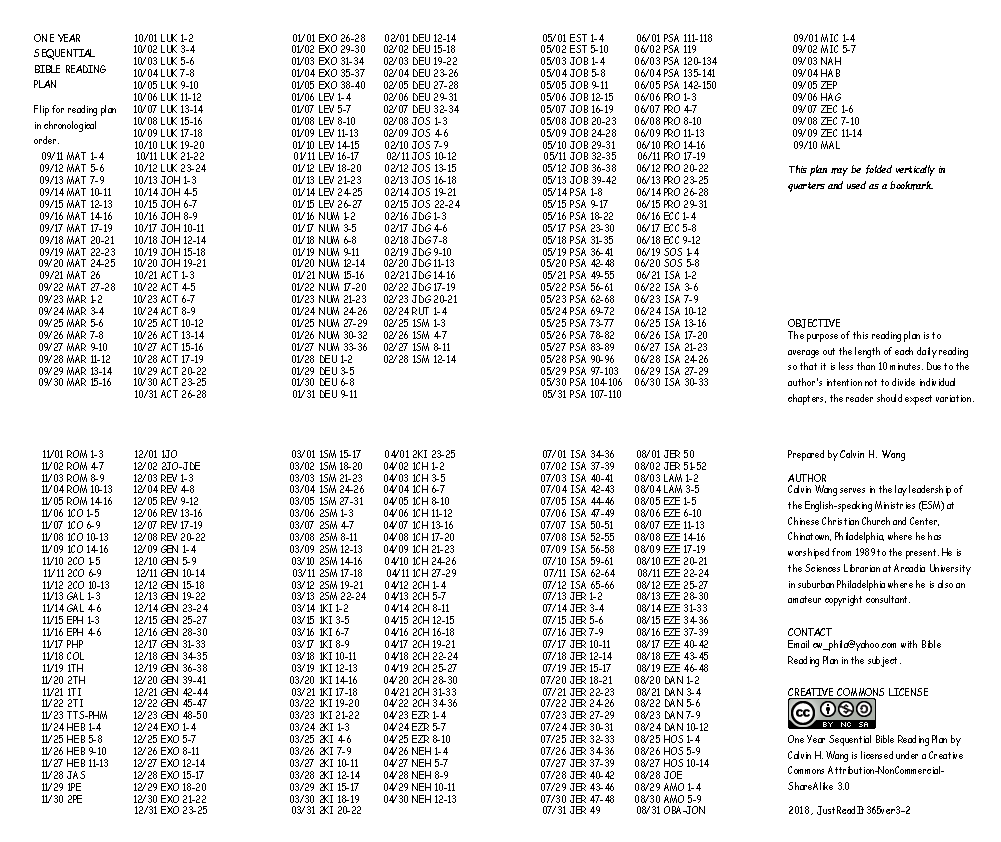 Download Just Read It 365 as a PDF file. SIDE 1 is in chronological order, i.e., in order as the events take place. SIDE 2 is in sequential order, i.e., as printed in standard bibles, canonically.